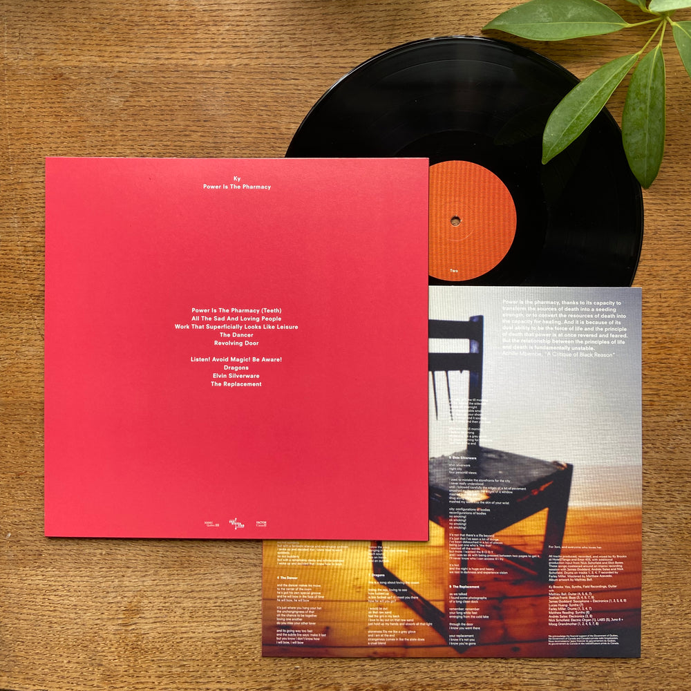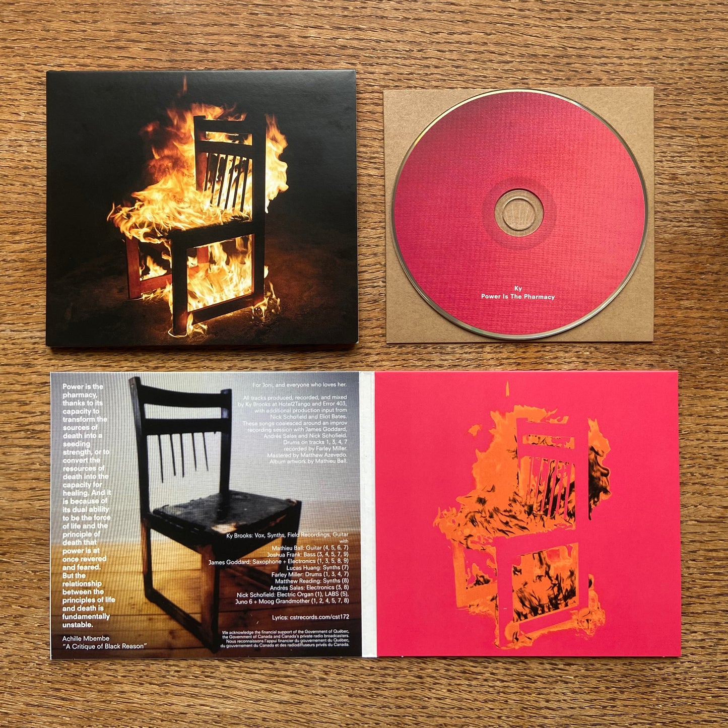 Ky is the new “solo” project of Ky Brooks, best known as vocalist and lyricist of noise-punk trio Lungbutter and a slew of other Montréal-based out-music projects like 8-person queer punk band Femmaggots and experimental/improv trio Nag. Power Is The Pharmacy is an album of cerebral and visceral outsider artpunk “mainly about grief, death, the fear of loss, losing dreams, losing youth, people, public space, ultimately oneself”—an emotionally electrifying, genre-spanning collection of songs fuelled by Ky’s piercing poetry, both spoken and sung, that delivers an acute blend of incisive socio-political observation and spiritual sadness, swirling through vortices of disenchantment and re-enchantment.