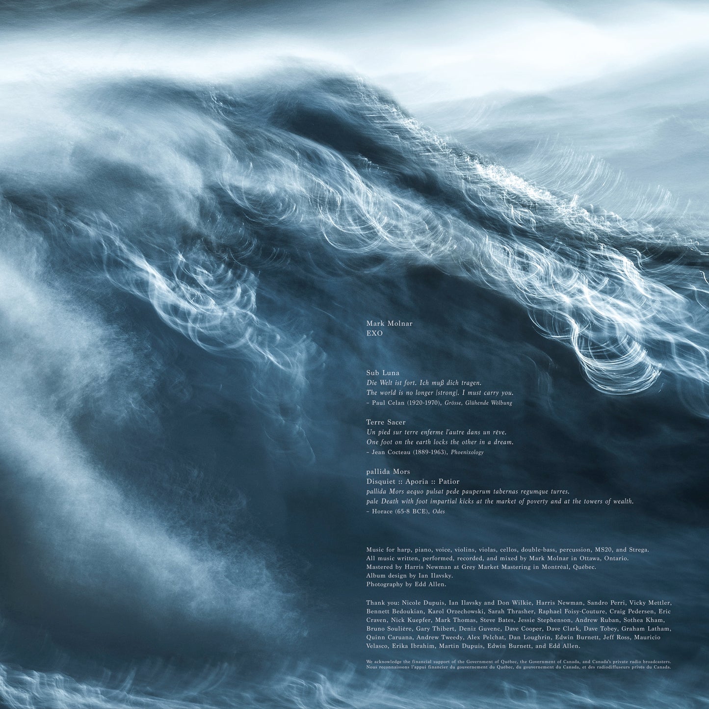 While Molnar is a highly trained string player, and studied music under Aubrey Wolfe, microtonality with James Tenney, and composition with R. Murray Schafer, his trajectory has been entirely and intentionally outside the academy, signalling a socio-artistic commitment to DIY culture, forged from an early passion for the sonic worlds of post-hardcore, post-punk, no-wave, free improv, power electronics, and other independent/underground musics. His classically-informed works have been described as “tense currents of musical modernism invigorated with punk’s raw vitality.” EXO carries an undercurrent influenced by dark industrial and ambient metal in particular, with microphones purposely placed to pick up the low-end frequencies of the piano body, and of a bass drum positioned as a resonant skin in the acoustic space; an electroacoustic strategy organically meshed to the crisply defined and pristinely recorded pointillisms and polychords of strings, harp, and piano, which feed into this noisefloor of crepuscular sub-bass disquietude and decay. It’s a production aesthetic that lends EXO a distinct undertow of tension and feeling, a sort of roiling maximalism where the chamber instrumentation traces arcs and waves of form and flow as if drawn from a dark, impervious ocean below. It also reinforces the profound hermeticism of Molnar’s process, as a forbiddingly solitary creative act of immersion and navigation. The album artwork, featuring semi-abstract stills of the sea by British photographer Ed Allen, further reifies this metaphor.