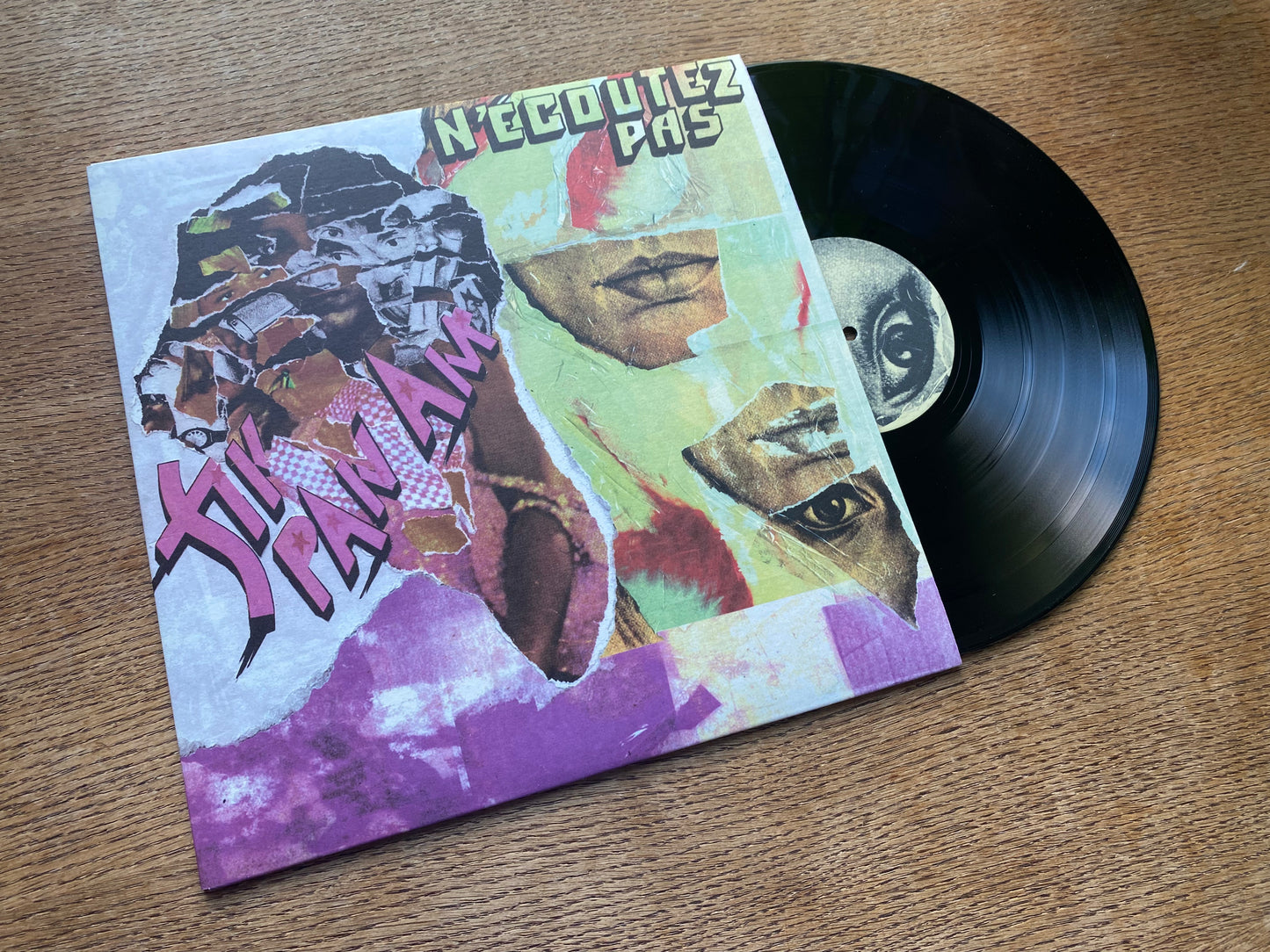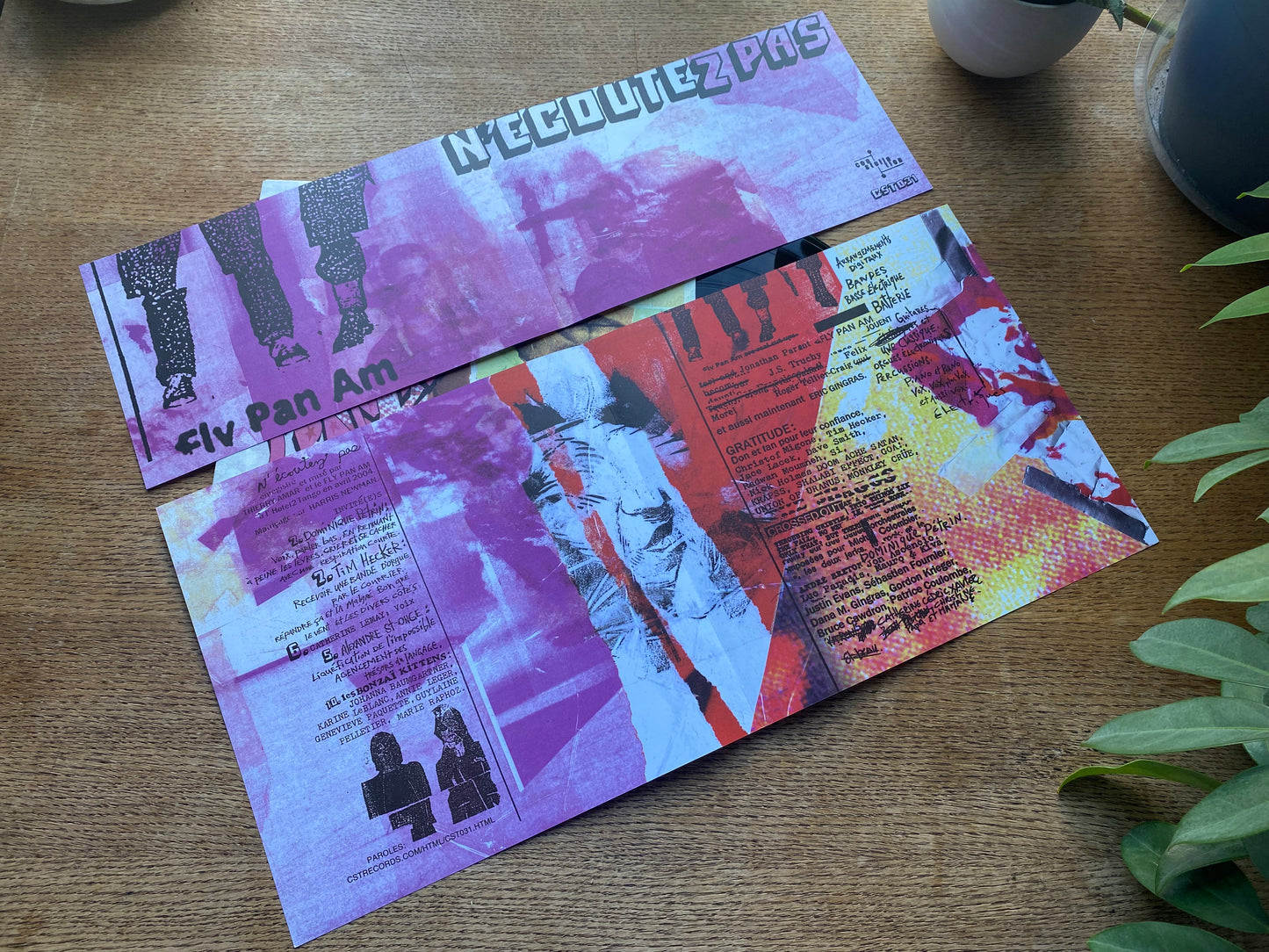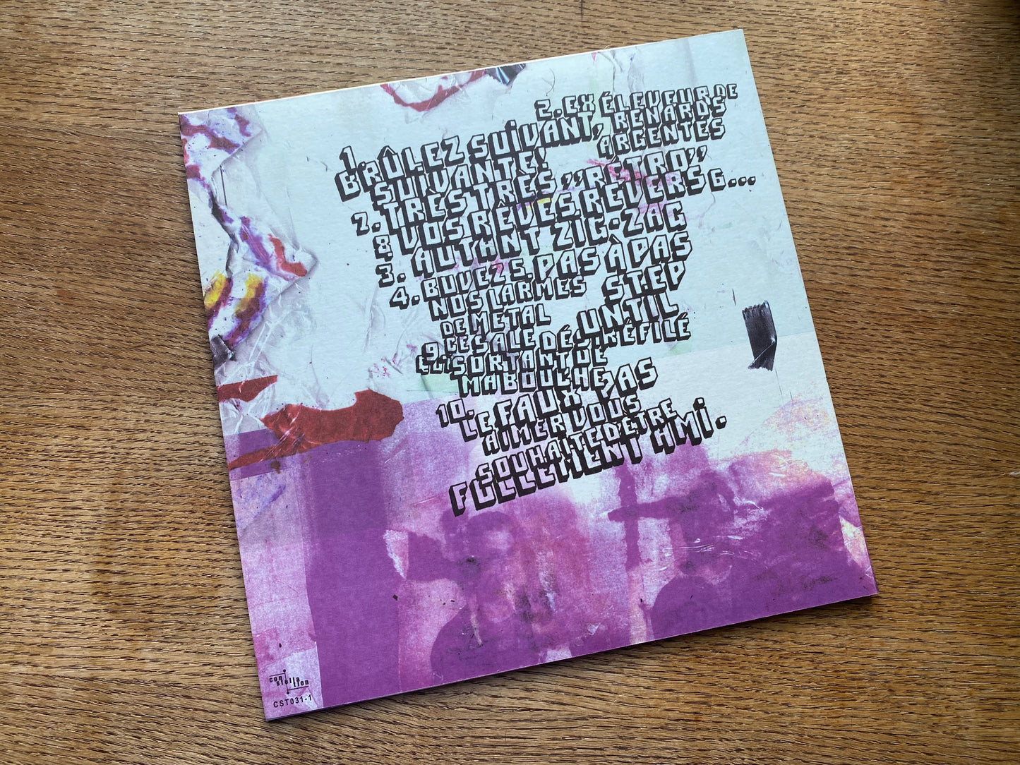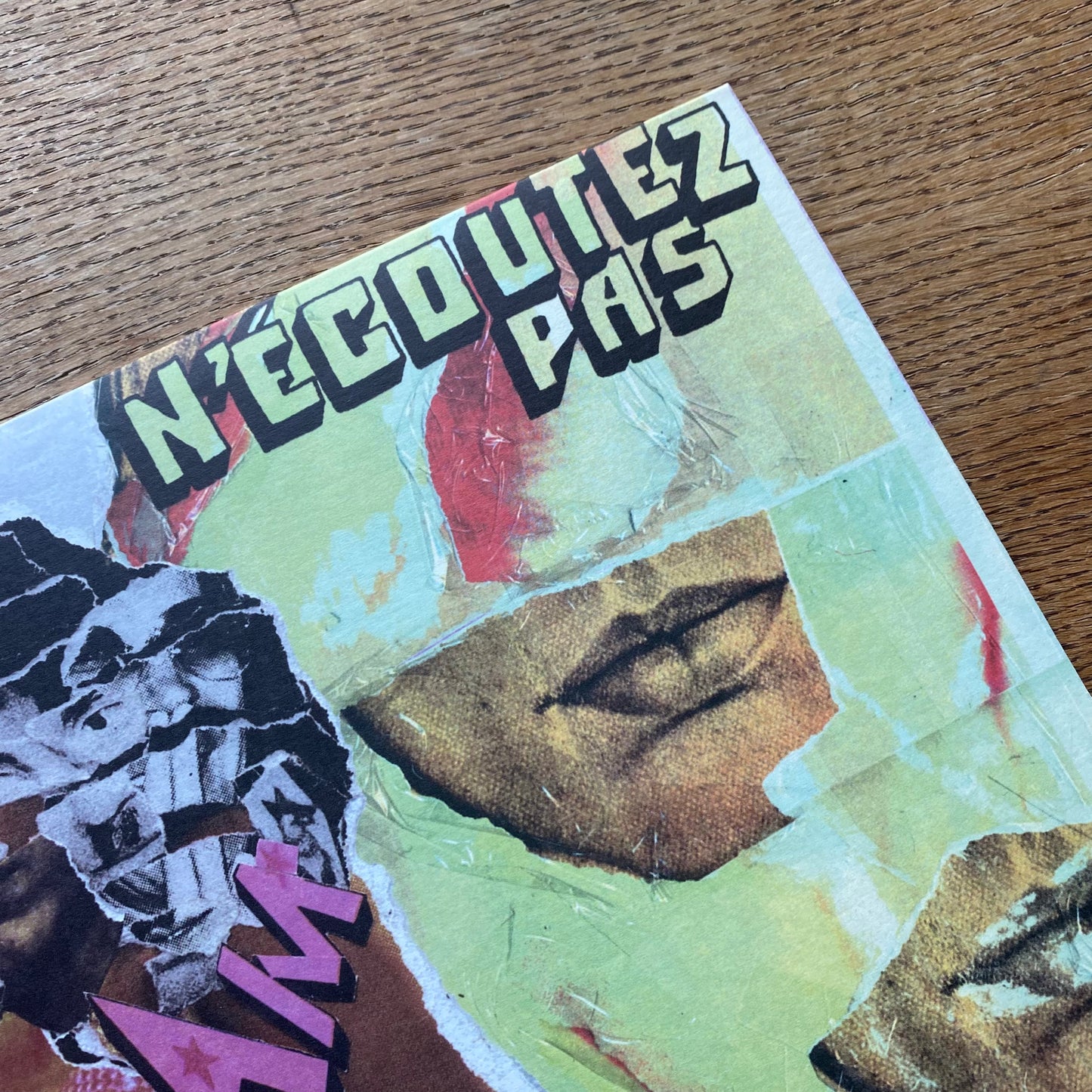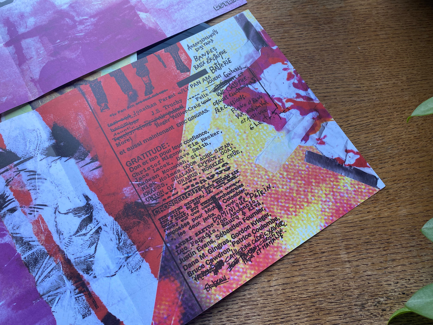 A collection of songs pushed to maximum density, marked by dark shoegazer guitars, distorted organ stabs, rubbery basslines, motorik drumming and various shrouded voices whispering, screaming and singing along the way – this album contains Fly Pan Am’s most intense sounds yet. While each side of the record is anchored by a long, non-linear piece juxtaposing the band against tape and electronic treatments, several tracks are as close as the group came to traditional rock/pop structures, with ‘chorus’ breaks, melodic ‘hooks’ and vocals. Of course, being Fly Pan Am, all of this is duly bracketed – there is nothing traditional about the results, and the various elements are pushed forward or pulled back in anything but conventional ways. These are careening, carnivalesque tunes that somehow wed the browns and pinks of their guitar noise with yeye pop, Boredoms-style noise incantations and hardcore punk. N’écoutez pas features a long list of local guest vocalists to supplant the band’s own oral action, as well as electronic interventions from fellow Montrealers Tim Hecker and Alexandre St-Onge.