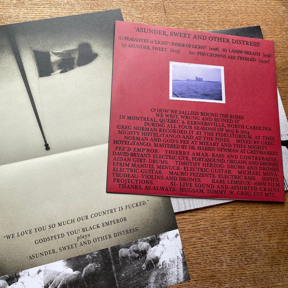 "Things sound bigger and bolder and more emotionally loaded, for whatever reason, when Godspeed’s music is playing. A lonely pigeon flying past your window can look like an ominous harbinger of doom, or like a symbol for collective hope, depending on what part of the album you’re at. With 'Asunder, Sweet And Other Distress', they’ve cut out some of the more atmospheric elements of their sound — the scratchy foundsound samples, the faraway ambient crackles. But they haven’t lost any of the primal force that makes them some thing more than a band. If it catches you at the right moment, this is music that can make you glad to be alive." – Stereogum