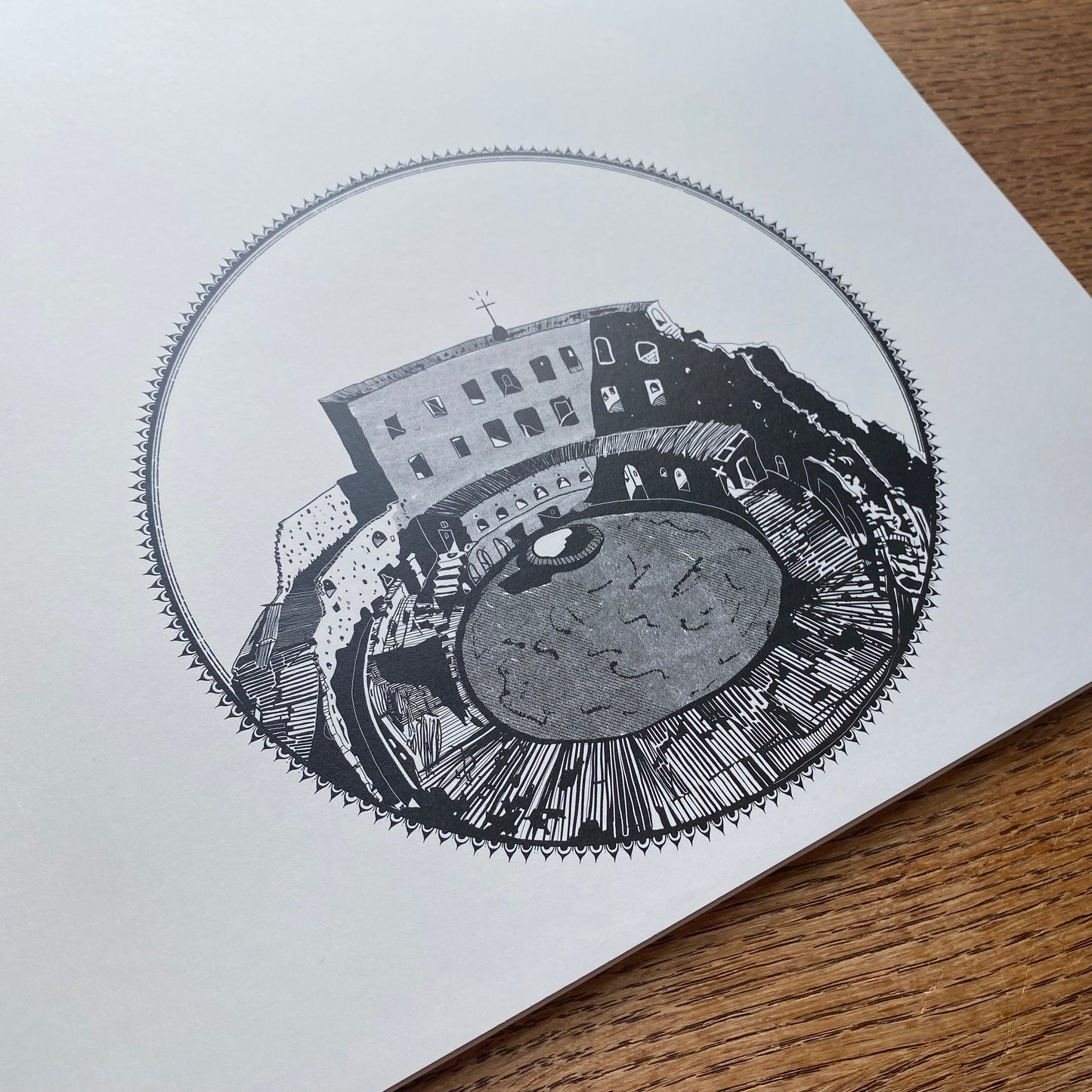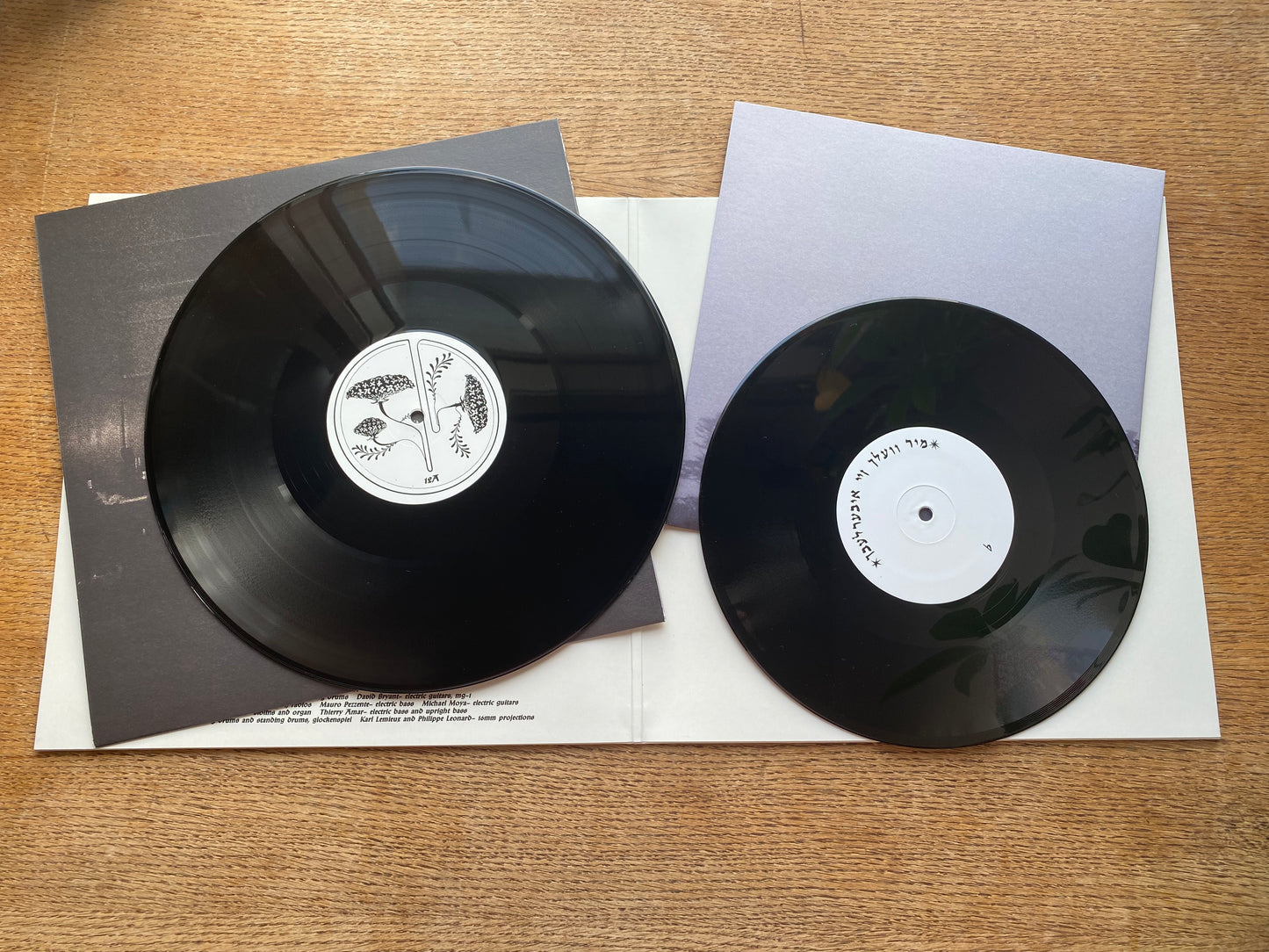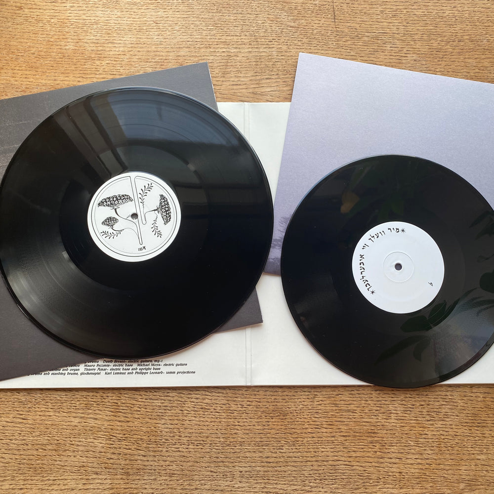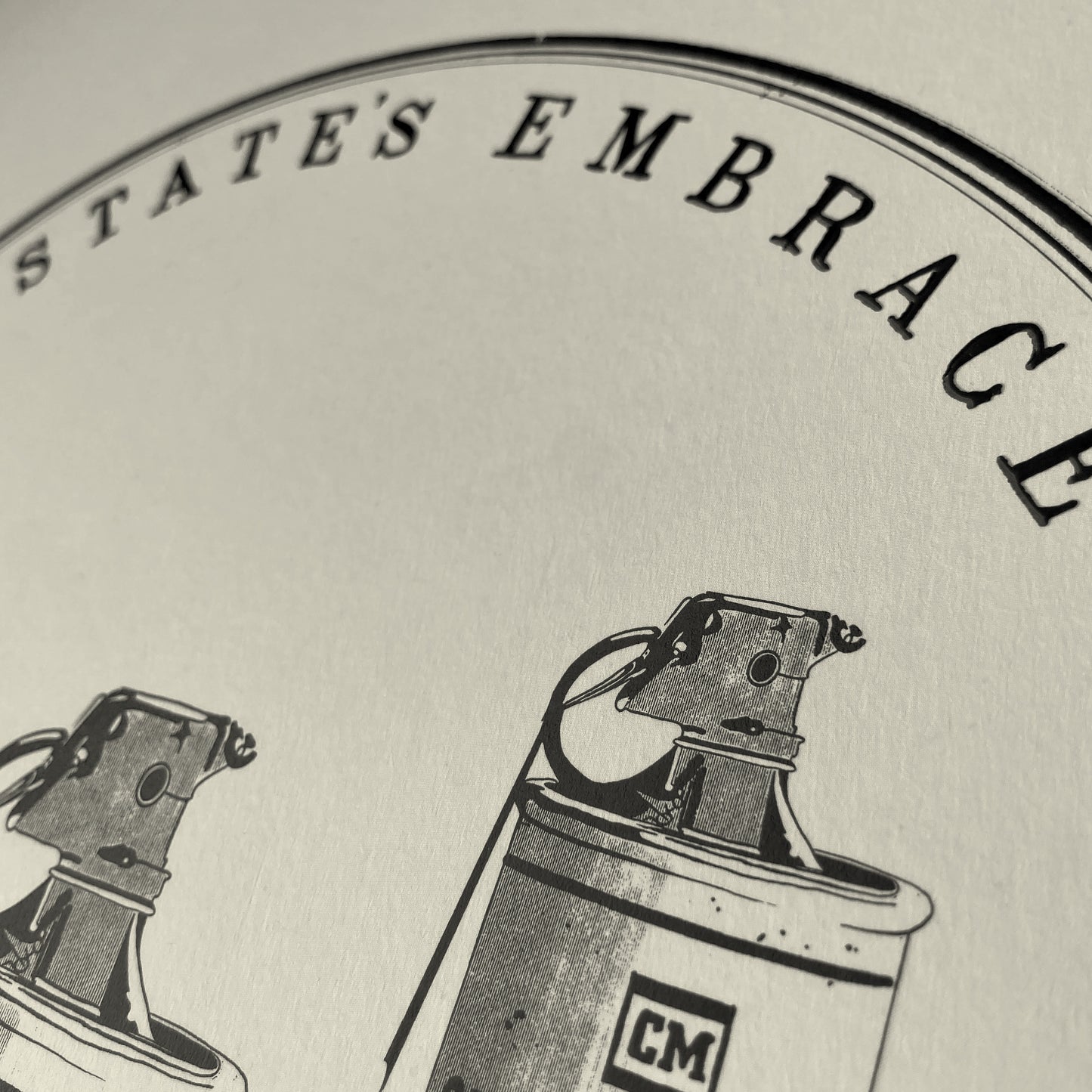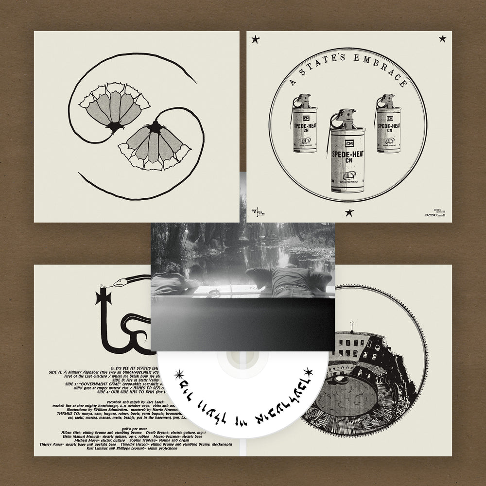 Just as STATE’S END summons the gamut of Godspeed’s constituent sonic trademarks, so the album artwork spans the entirety of the band’s visual history: the grainy monochromatic photography of recent releases finds its way onto the inner sleeves, while the gatefold cover art harkens back to the iconic graphics of earlier classic records like Slow Riot For New Zero Kanada and Lift Your Skinny Fists Like Antennas To Heaven. STATE’S END features illustrations by William Schmiechen, with the front cover taijitu flowers and back cover tear gas canisters rendered in raised thermographic black ink on the double-vinyl album jacket. The illuminated cross from Godspeed’s debut F#A#∞ also makes a reappearance on the inside gatefold drawing, in recurrent homage to the electrified hilltop landmark crucifix of the band’s Montréal hometown.