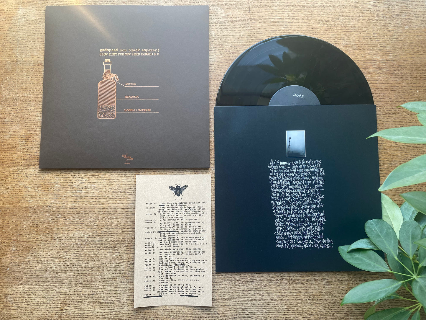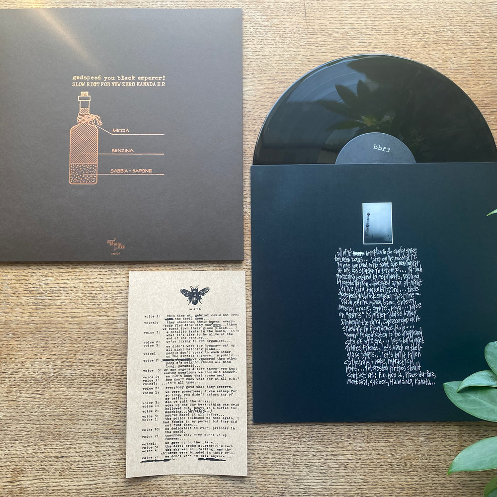 Our second vinyl-only release from Godspeed contains two long songs, and sets the bar for the sprawling compositions that would characterise the group in the years to follow. Side A is cut at 45rpm and features “Moya”, a broiling cascade of upward scales that repeatedly explodes beyond its own threshold. “BBF3” on Side B clocks in at 18 minutes, and was the band’s most lyrical, multi-movement music to date — more elaborated melodic figures wind around an angry spoken-word field recording (infamously culminating in the recital of the speaker’s poem — verses lifted straight from Iron Maiden). Both songs were recorded with Dale Morningstar at the old Gas Station studio in Toronto.