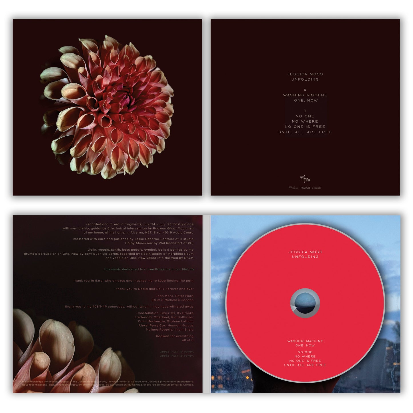 Working closely with producer Radwan Ghazi Moumneh (Jerusalem In My Heart), Moss notes "Unfolding was made slowly, over the last 12 months, the second full year of genocide in Palestine, in direct response to our collective witnessing, our collective grief, as a portal to collective mourning, as a searchlight through our internal weather systems, seeking one another out in the dark." The inseparability of the personal and political has wrung ever tighter for Moss these past two years, as for so many. She’s co-organized and played several benefit shows as a core member of the Montréal chapter of Musicians For Palestine, and she released the solo album For UNRWA in spring 2024 (garnering over 800 supporters and raising thousands of dollars).