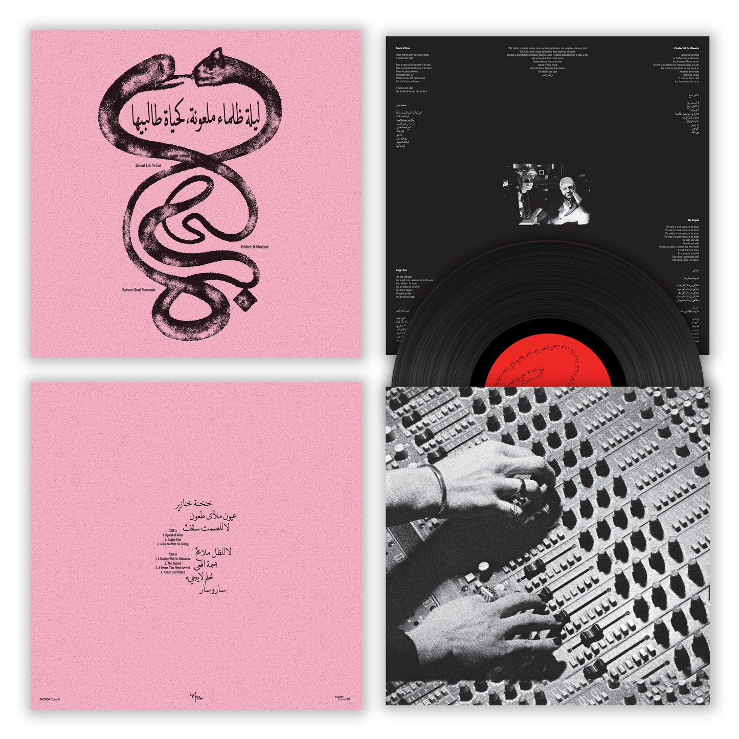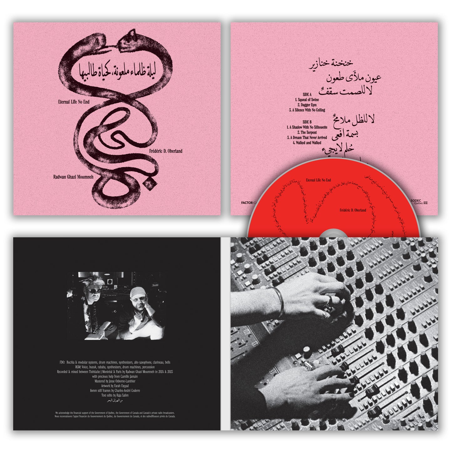 "Squeal of Swine" and "Dagger Eyes" open the album with dual gut punch, as hand percussion, low end synth tones, and ricocheting buzuk and rababa set the stage for Moumneh’s keening Arabic singing, reflecting a sea of sickness currently drowning the state of humanity. On the instrumental track "A Dream That Never Arrived", a lo-fi dancehall-inflected beat anchors otherworldly melodic lines set against electroacoustic sound design in spatio-temporal displacement. Eternal Life No End is accompanied by an audio-visual essay for the electronic (and vocal) song "The Serpent", assembled by Oberland and shot on Super 8mm camera in Montréal, Paris and Beirut, including footage of Gaza protests in Paris, and of the Frequent Defect event at Irtijal Festival’s 25th anniversary edition in Beirut. Lebanese graphic designer, printmaker, and calligrapher Farah Fayyad provides talisman-like artwork of entwined serpents, similarly inspired by this centerpiece album track.