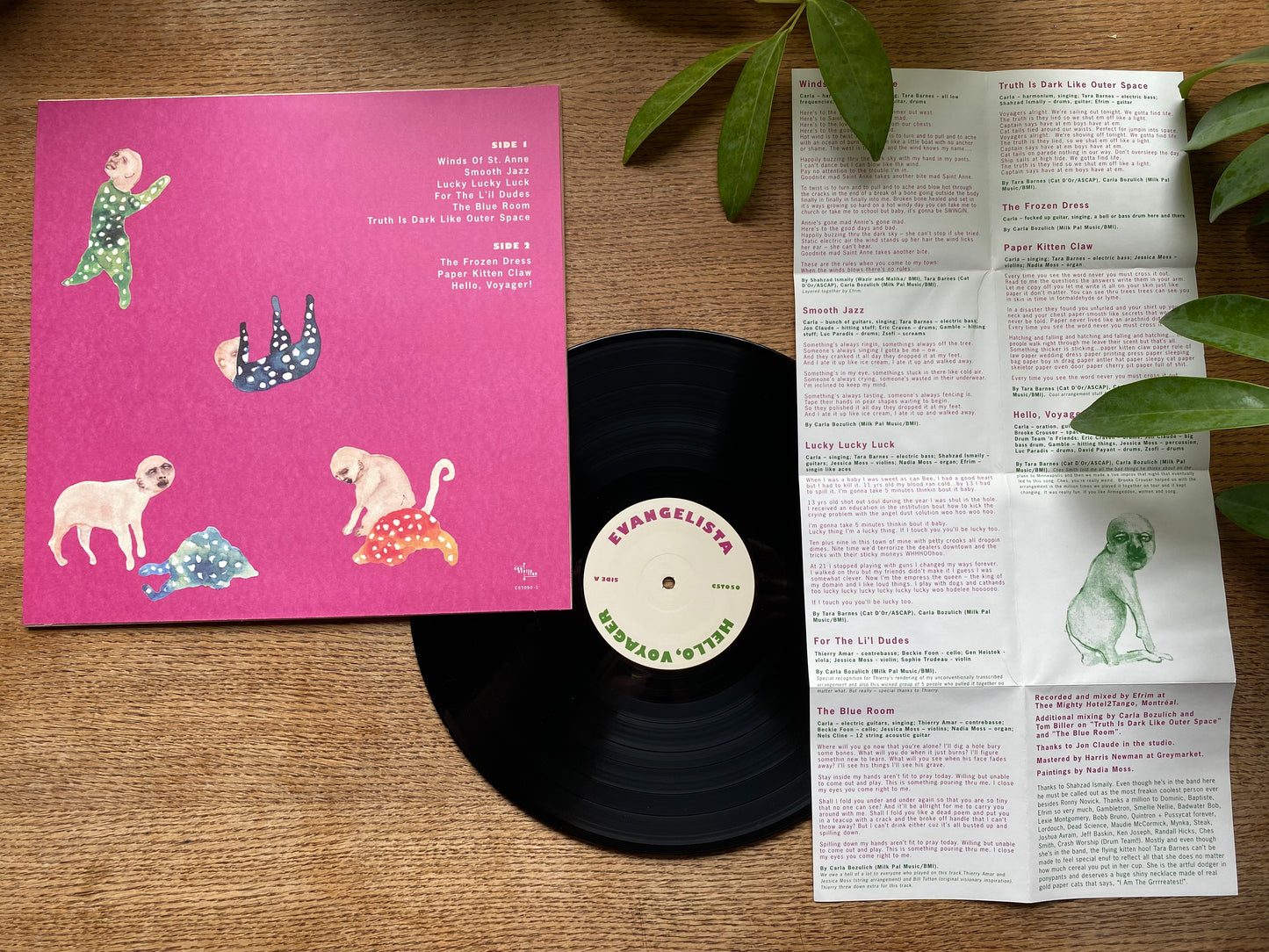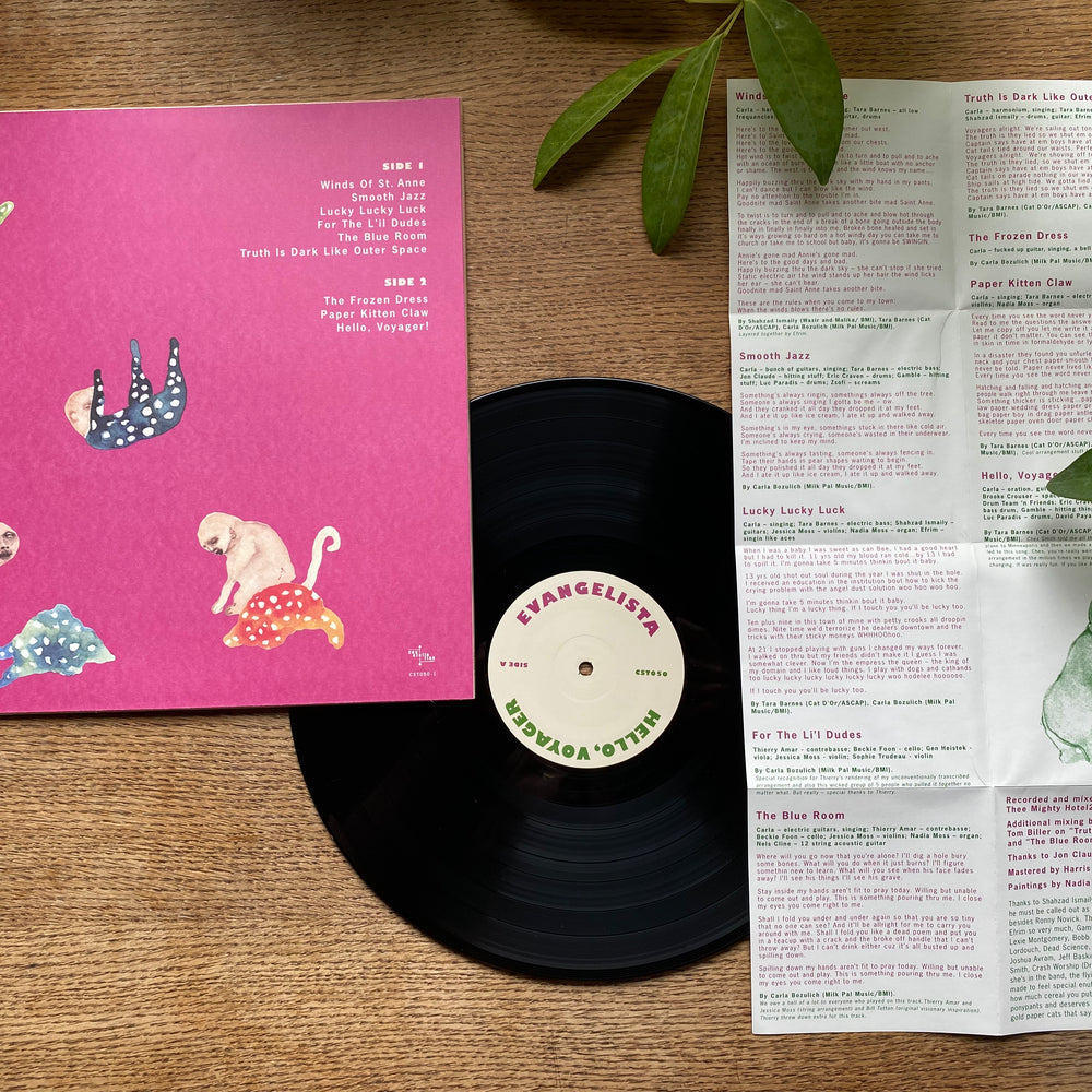 The Evangelista band continues to comprise Carla and Tara as its nucleus, and continues to build on its relationship with Montreal. Hello, Voyager was recorded in Montreal at the Hotel2Tango by Efrim Menuck in late summer 2007, with an even larger cast of Montreal musicians joining Carla, Tara and Shahzad this time around, to work up a more stylistically diverse batch of songs. Raw, beautifully ravaged, semi-improvised soundscapes underpin Carla’s incantatory sung and spoken lyrics on the album’s opening and closing tracks, but much of the rest of the record is more overtly composed. Blistering nuggets like the snarling “Smooth Jazz” and the desperate “Truth Is Dark Like Outer Space” are the most rocking tunes Carla put to tape since the demise of The Geraldine Fibbers, while “The Blue Room” (one of Carla’s finest songs, and one she has been carrying around for many years) was finally captured in a stunning studio arrangement that includes organ, violin, cello and contrebasse. “Lucky Lucky Luck” is a playful, sassy, fractured take on the misfit narrative and “Paper Kitten Claw” is its methodical, reflective, poetic foil. Carla’s voice perfectly sets and channels the prevailing mood on each song, and is strong as ever.