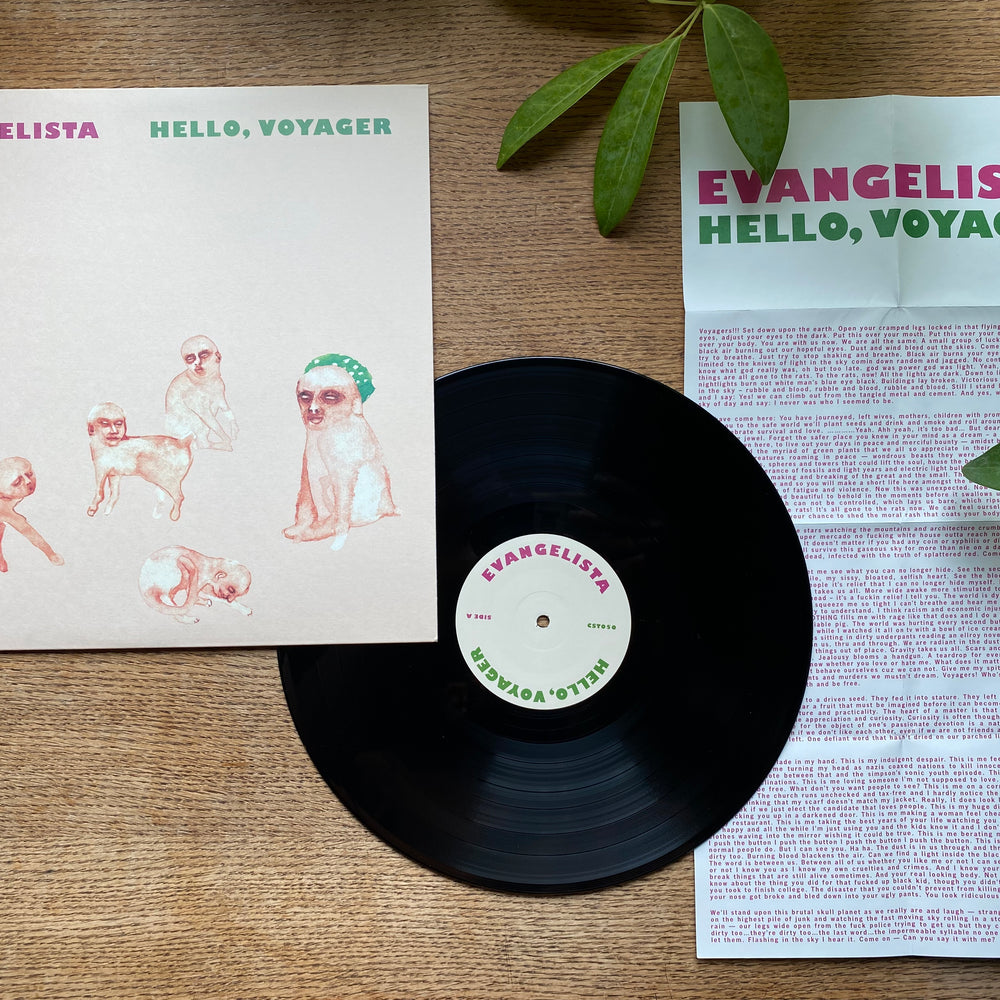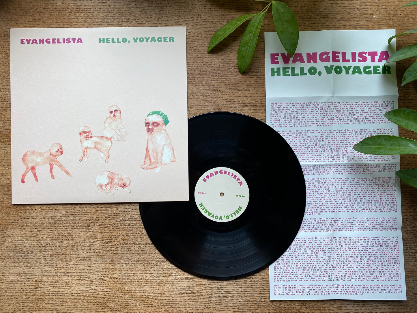 We can call this a debut record of sorts, as it is the first album to be released under Carla Bozulich’s band moniker, Evangelista. Bozulich’s first record for Constellation, issued in 2006, was released under her own name, and bore the album title Evangelista. That album title has now migrated to become the band name. So…this album is titled Hello, Voyager, by the band Evangelista, featuring Carla Bozulich.