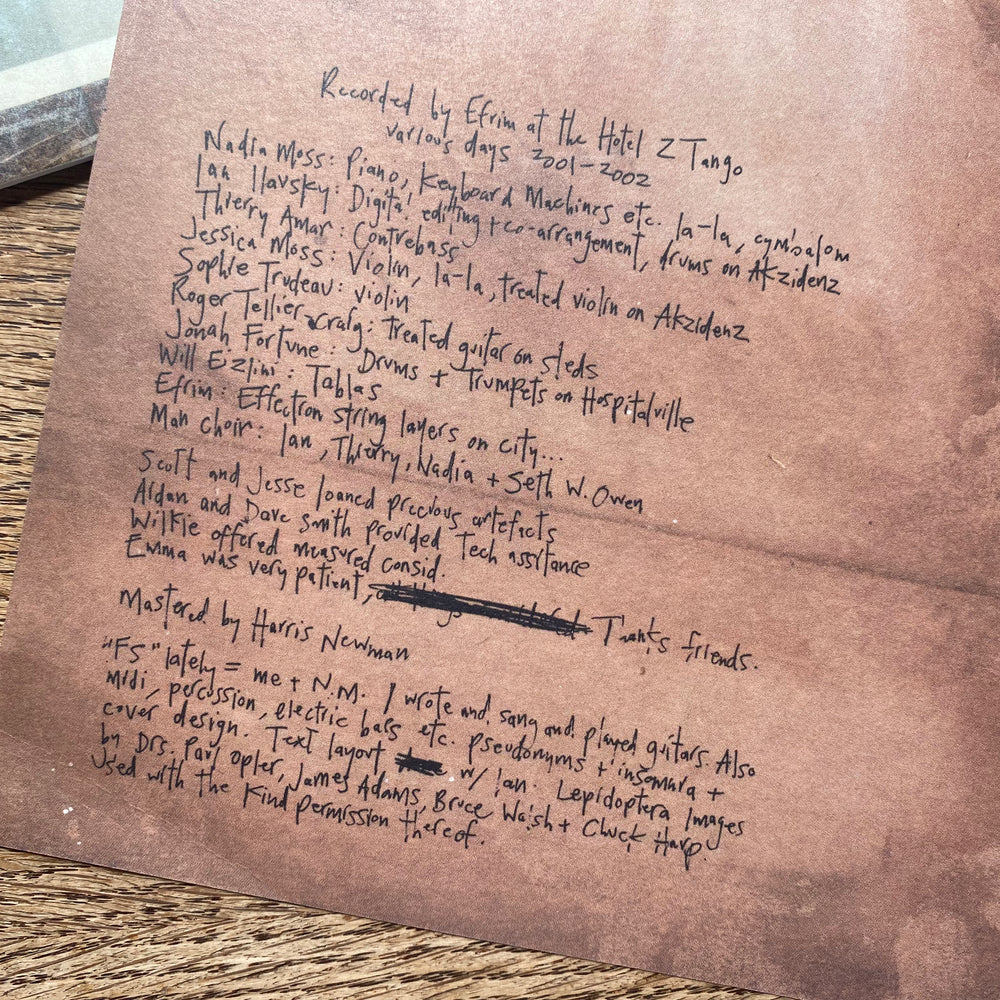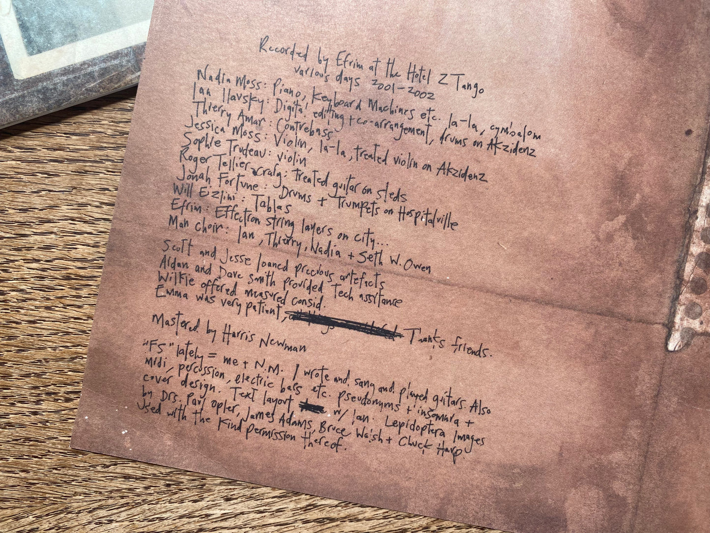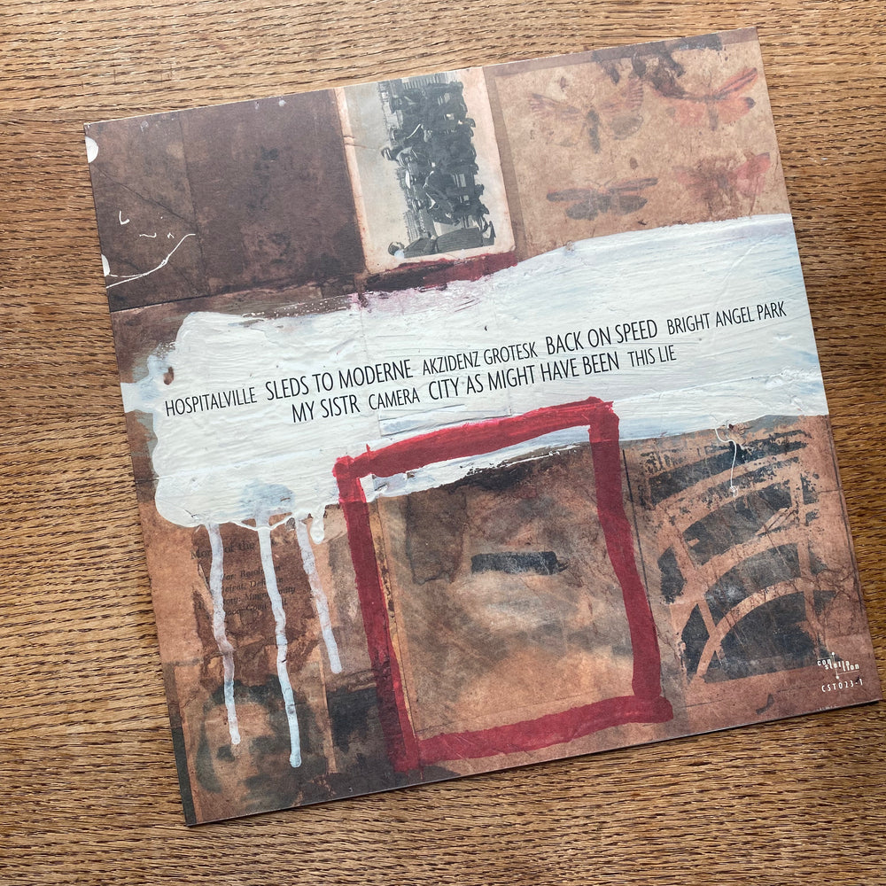 Sparo’s inimitable intimacy is well-preserved on several of these tracks; the fragility of guitar paired with Moss’ piano/organ can be heard to great effect on “Bright Angel Park” and “This Lie”. With an additional element – bass in “My Sistr”, digital treatments in “Camera” – the carefully expanded palettes play with countervailing forms: modern jazz ballad and naive music-box lullaby. But Sparo also assembled larger ad hoc bands for various set pieces on the album. Album opener “Hospitalville” is a fluid, slow-burning swing complete with drums, bass and trumpets – a brilliant arrangement set pumping by Efrim’s heavy compression treatment (he recorded the album at the original Hotel2Tango). A men’s choir later makes a brief appearance, as do some digital de/reconstructions, on the record’s two rock songs, “Akzidenz Grotesk” and “Back on Speed”. Sparo can always be counted on for top-notch reflection and erudition in the lyrics department, so if you enjoy language, give these a close listen. A very fine and complex collection of poetic music.