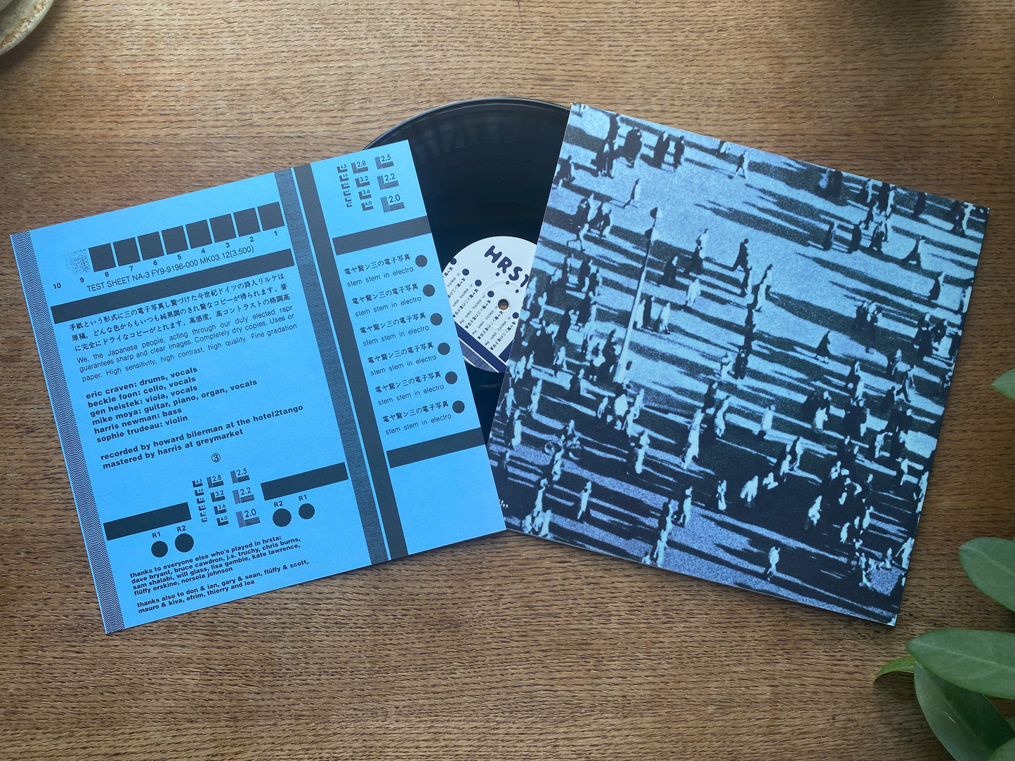 Stem Stem In Electro is a gorgeous collection of songs painted in psych-rock tones and timbres, minor-key progressions, and unsettling invocations of haunted transcendentalism. The opening track, with its trance-like group chorus of “we climb to the light”, conjures up a cultish hymn, with Moya’s guitar howls and washes underscoring the disquieting downwards chord structure. This sets the stage for “Blood On The Sun”, a chilling ballad delivered in Moya’s otherworldly voice, like a sedated Daniel Johnson or Wayne Coyne. The trip continues with a delicate instrumental and the tremulous swing of “Folkways Orange”. Side two starts with the album’s centrepiece, “Swallow’s Tail”, where a metallic pulse introduces a spooky, magickal romp, channeling the Canterbury spirit of bands like Caravan and Khan. This nod towards 70’s-era English prog carries through to the end of the album, terminating in the majestic closing instrumental, with more phantasmic group singing as a final send-off. Stem Stem In Electro casts its spell from the opening notes and paints a shadowy, saturated world surveyed alternately from ground level and from on high. Recorded at Montreal’s (original) Hotel2Tango by Howard Bilerman, Moya enlisted Eric Craven (Hangedup) and Harris Newman (solo, Sackville) as his rhythm section, along with Montreal string-playing stalwarts (and fellow Set Fire to Flame cohorts) Beckie Foon, Gen Heistek and Sophie Trudeau.