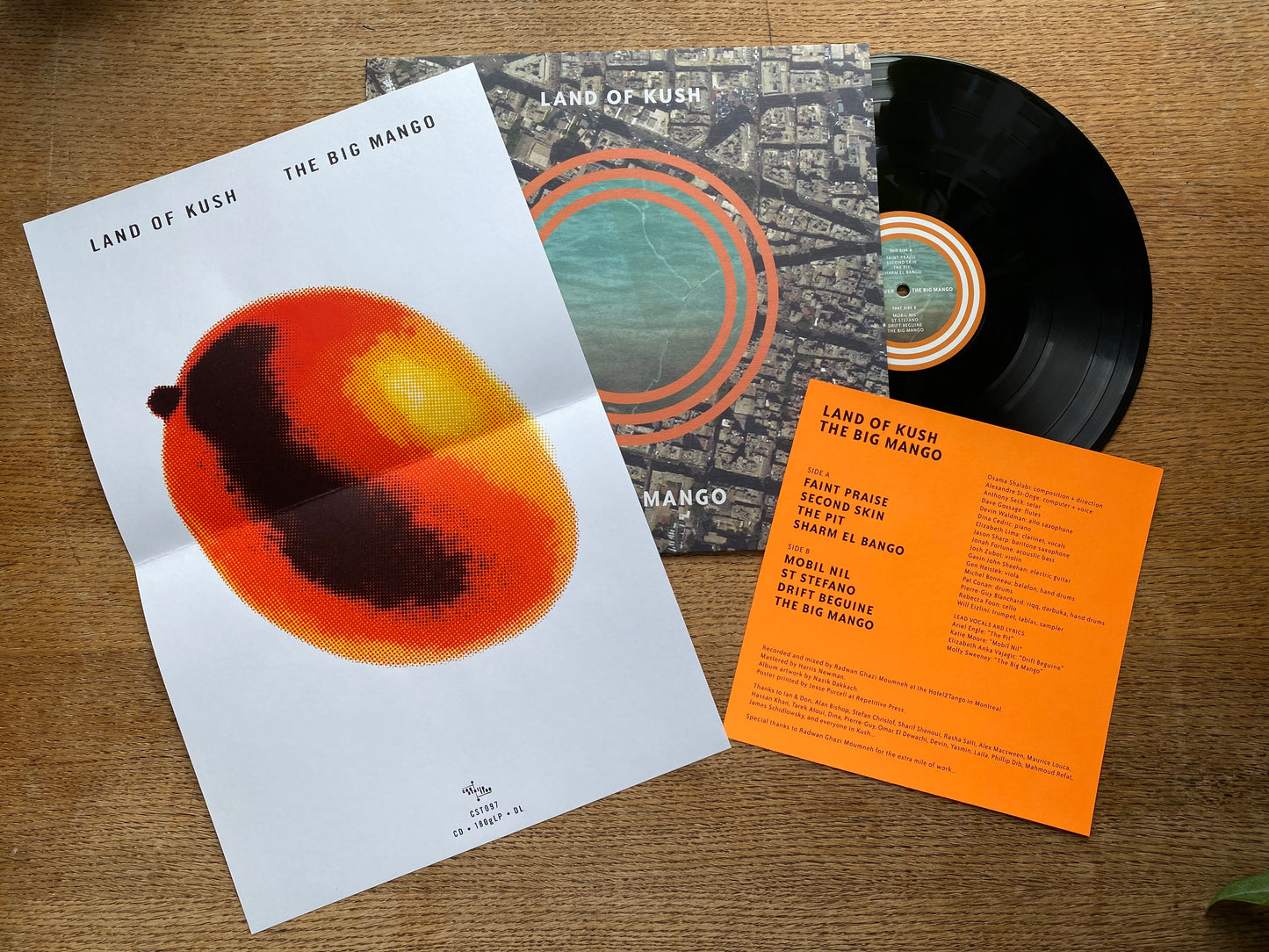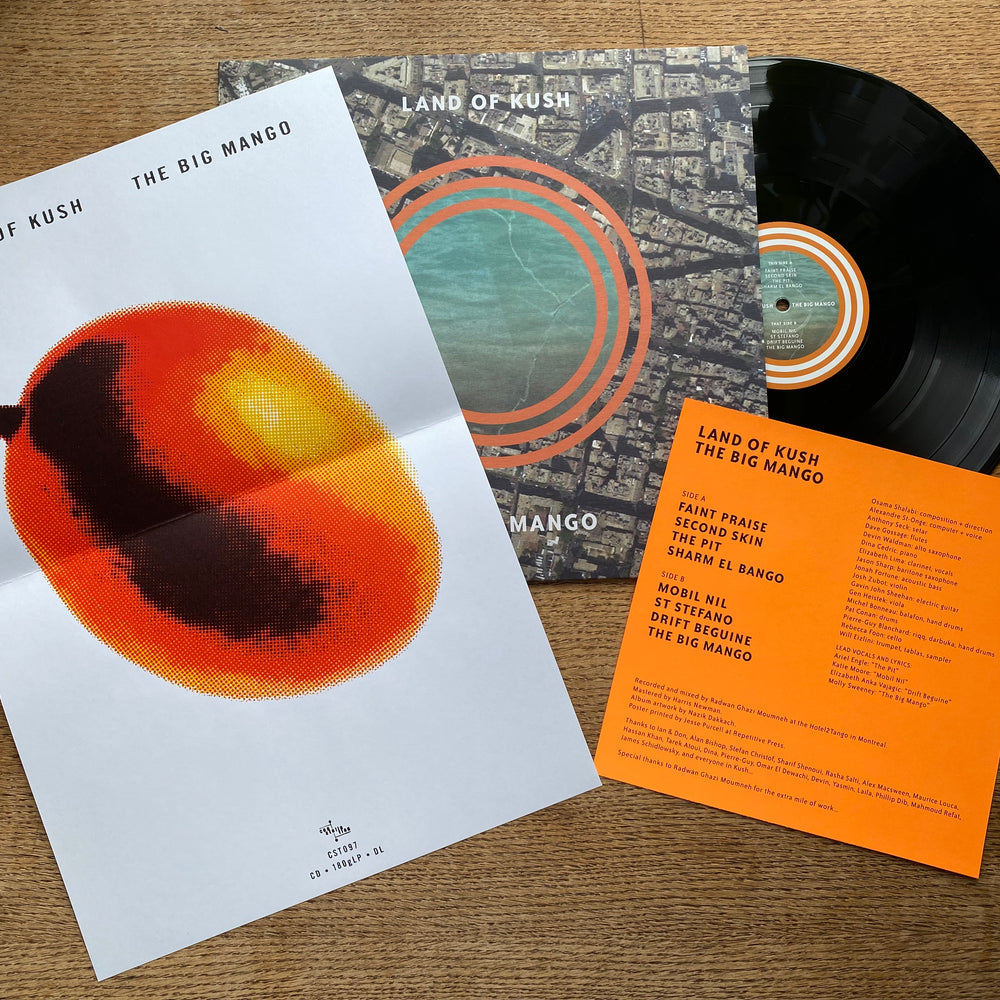 The natural and implicit libidinal energy of rock and roll long since taken for granted in the West is re-situated in The Big Mango, where the album's centrepiece songs – "The Pit", "Mobil Nil", Drift Beguine" and the album's closing title track – are each highlighted by superlative, propulsive female vocal performances (and individually-authored lyrics) by Ariel Engle, Katie Moore, Elizabeth Anka Vajagic and Molly Sweeney respectively. Underpinning each of these singers is some of Shalabi's most melodically and rhythmically satisfying writing, conjuring a post-modern psychedelia that is truly sui generis. The Kush band delivers the grooves and soloists unleash excursions more fluidly than ever; for many of these players, it's the third time around embracing Sam's music, getting inside the score, and following his conduction. In combination with the peaking intensity and electricity of Shalabi's compositional vision, The Big Mango coheres, sparkles and soars: a distillation of the sonic trajectory Land Of Kush has been charting for the past five years.